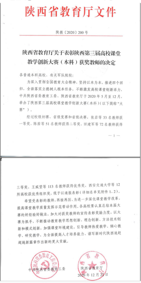 全面落实立德树人根本任务,不断激发高校课堂创新活力,中共陕西省委教育工委、陕西省教育厅于2020年5月至12月,举办了陕西第三届高校课堂教学创新大赛(本科)。