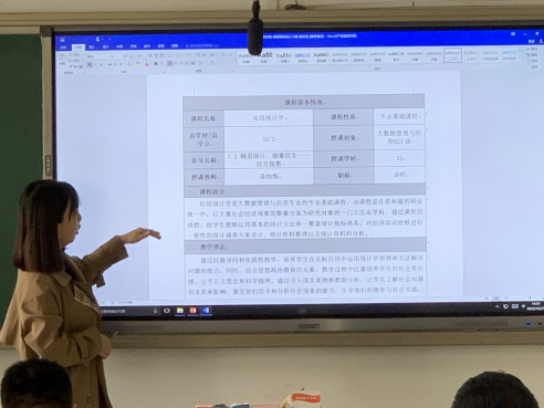 姜怡悦老师结合本年度课程思政大练兵活动的获奖经验,将思政元素如何融入教学设计、教学方法、教学仪态、语言表达等几个角度,针对《应用统计学》课程进行了观摩课展示与经验分享,参会教师进行了积极的交流与互动。
