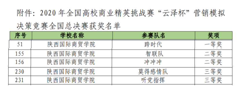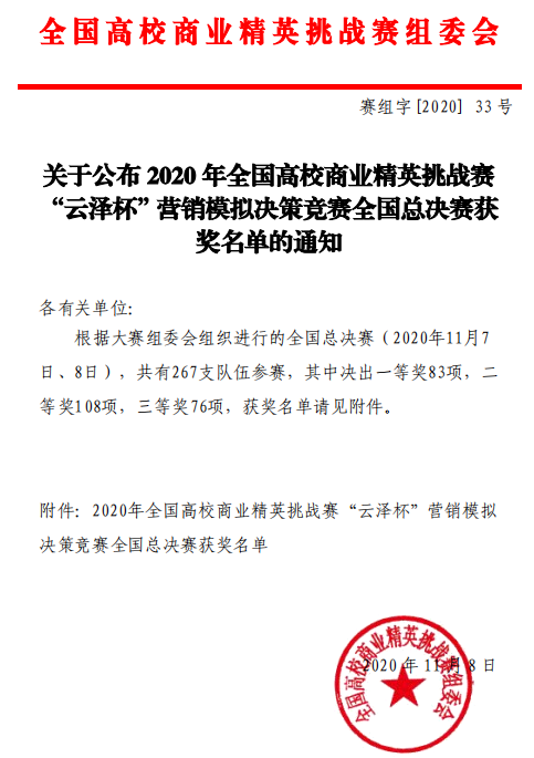 2020年11月7日—8日,2020年全国高校商业精英挑战赛“云泽杯”营销模拟决策竞赛全国总决赛成功举行,国际经济学院选派的4支参赛队伍同来自北方工业大学、上海大学、吉林师范大学等省内外160所高等院校267支参赛队伍在线竞技,通过激烈角逐,最终荣获全国总决赛一等奖1项、二等奖2项和三等奖1项的好成绩。