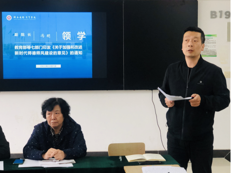 随后,副院长冯明带领与会教师领学了教育部等七部委联合下发的《关于加强和改进新时代师德师风建设的意见》及《陕西省师德师风建设三年行动计划(2021-2023年)》等文件。进一步明确了在专项活动中的建设目标和任务,要求全体教职工要遵守国家法律法规,心存戒律,明确底线红线是什么,用良好的师德师风展现我院教师风范,为学校特色发展、和谐发展和提升内涵建设而努力。