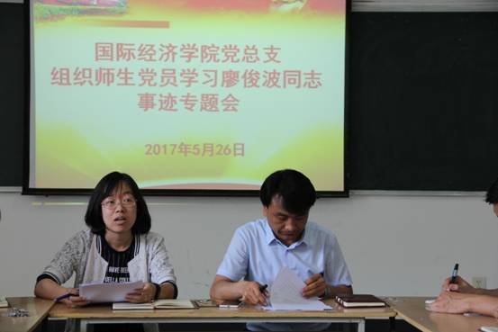 为了进一步推动“两学一做”学习教育的深入开展,在全院上下形成“学先进、赶先进”的浓厚氛围,5月26日下午16:00,国际经济学院党总支在2J320教室召开“学习廖俊波同志先进事迹”专题会议,党总支副书记张孝峰及全体师生党员参加了会议,会议由教工党支部书记张艳主持。
