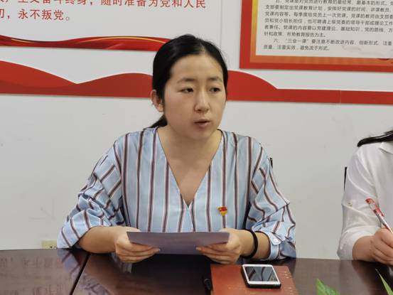 新党员代表李桥鸽在发言中表示:在建党99周年之际,光荣地成为一名正式党员,感谢党组织的教育培养,并对照“四个合格”,决心做到自觉提升思想觉悟,坚持读原著、学原文、悟原理,联系实际学、带着问题学、不断跟进学,做到学而信、学而思、学而行;着力解决自身问题,将对照党章党规,对照系列讲话,对照先进典型,把自己摆进去,着力解决发挥作用不够等问题;严格遵守党章党规,把尊崇党章、学习党章、遵守党章、维护党章作为最基本的要求,切实加强以党章为重点的党规党纪学习教育,不断强化党员意识和党章意识,自觉做遵守维护党章党规的表率;模范发挥先锋作用,立足本职工作,埋头苦干,奋发进取,努力创造一流的工作业绩,以实际行动影响和带动周围群众。