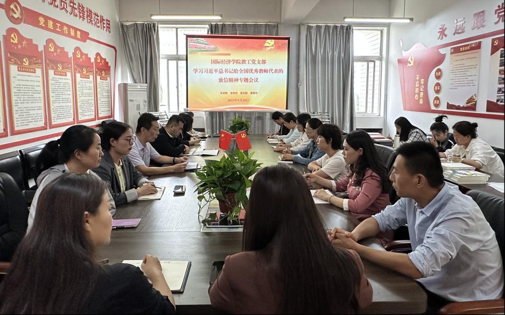 “躬耕教坛、强国有我!”在第三十九个教师节到来之际,中共中央总书记、国家主席、中央军委主席习近平致信全国优秀教师代表座谈会的各位教师,代表党中央,向他们和全国广大教师及教育工作者致以节日的问候和诚挚的祝福。国际经济学院教工党支部于9月20日下午,组织开展学习习近平总书记给全国优秀教师代表的致信精神专题会议。