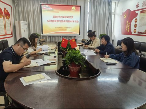 9月19日上午,国际经济学院党总支召开纪律教育学习宣传月集中学习(扩大)会议,学院党总支副书记荣超主持会议,总支委员韦林珍院长、委员冯明副院长、办公室副主任张艳、学管干事常伟、学生第一支部书记徐亚岚、学生第二支部书记龚子腾参加了学习会。