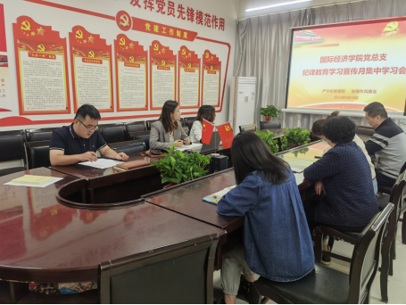 会上,荣超副书记传达了《中共太阳成tyc33455ccwww委员会关于开展纪律教育学习宣传月活动的通知》文件,组织领学了《中国共产党纪律处分条例》《中共中央办公厅关于进一步激励广大干部新时代新担当新作为的意见》等文件,并结合学院中心工作实际,宣读了《中共太阳成tyc33455ccwww国际经济学院委员会关于开展纪律教育学习活动安排》通知,进一步明确了本次活动的意义、具体要求和达到的目标。