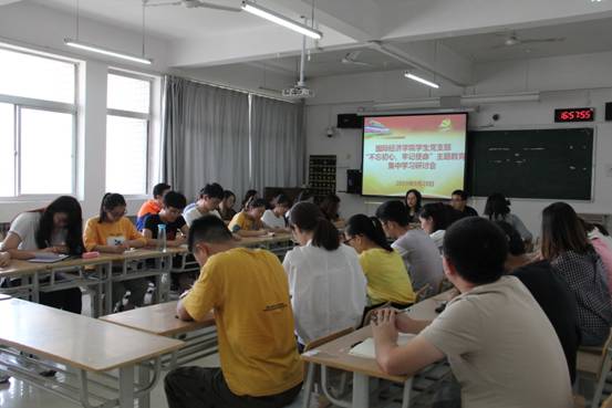 2019年9月25日下午16:30,国际经济学院学生党支部在2J422多媒体教室召开“不忘初心、牢记使命”集中学习研讨会,学生第一、二党支部全体学生党员参加研讨会,会议由学生第一党支部书记荣超主持。