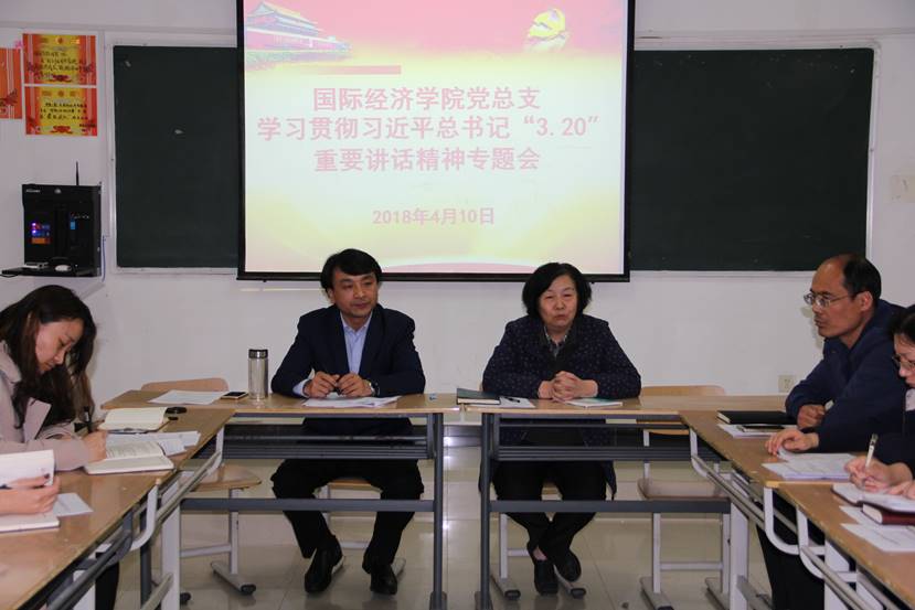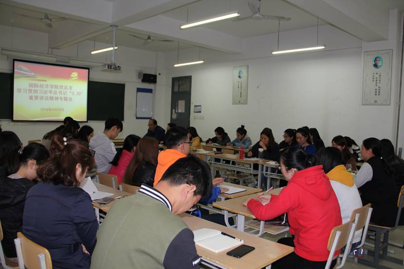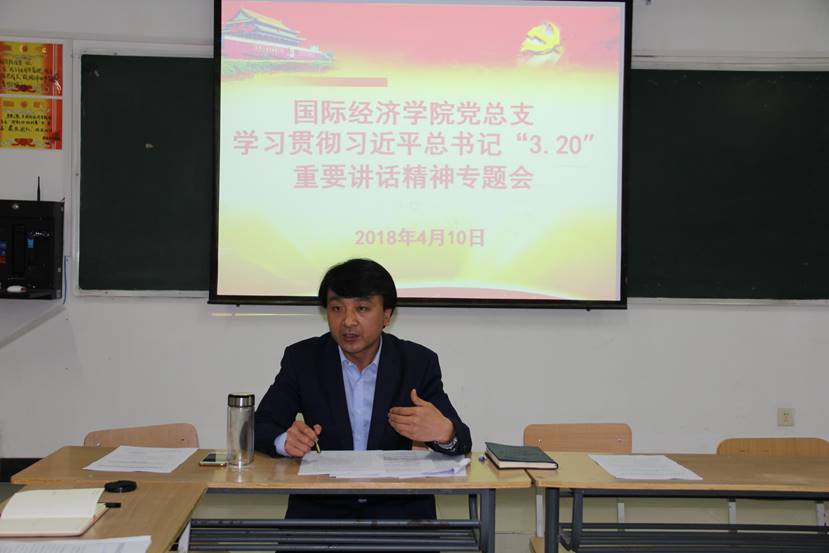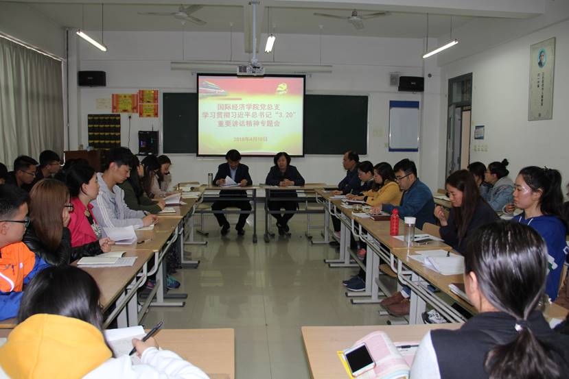 2018年4月10日,国际经济学院党总支在2J322多媒体教室召开专题学习会,集中学习习近平总书记在十三届全国人大一次会议上的重要讲话精神。学院全体师生党员参加了学习会,会议由学院党总支副书记张孝峰主持。