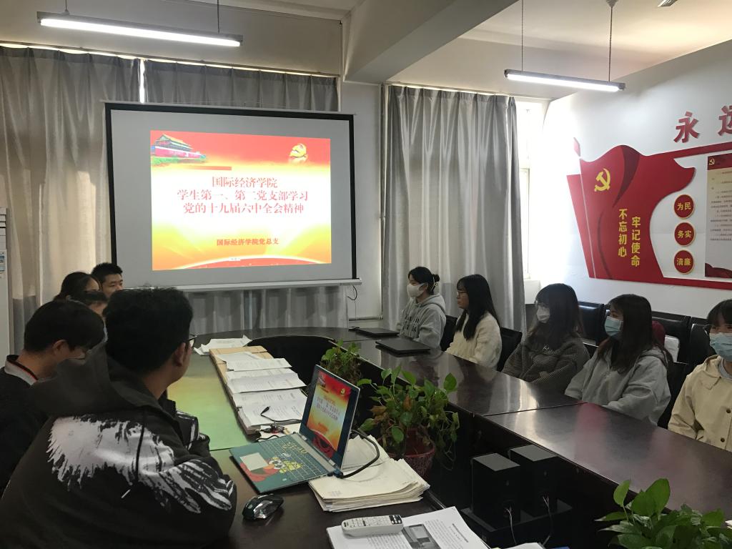 2021年11月17日下午,国际经济学院学生第一、第二党支部在党员活动室召开党支部会议,会议内容为集中学习党的十九届六中全会精神。会议由学生第二党支部书记李彤辉主持,学生第一党支部书记李义玲及全体学生党员参加。