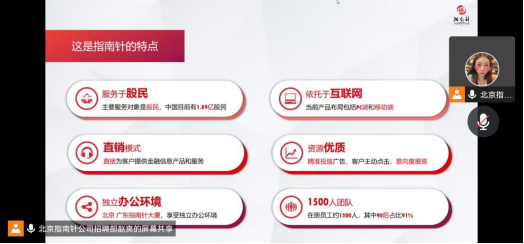 本次招聘会首先由北京指南针科技股份发展股份有限公司招聘主管向在场同学介绍了公司整体情况和新员工筛选标准。其次详细讲述了在北京疫情环境下,公司对员工的人文关怀,体现出浓厚的企业文化。最后招聘主管真诚地邀请我院应届毕业生加入北京指南针科技,期待学子们在公司创造价值,实现自我梦想。