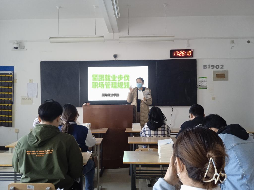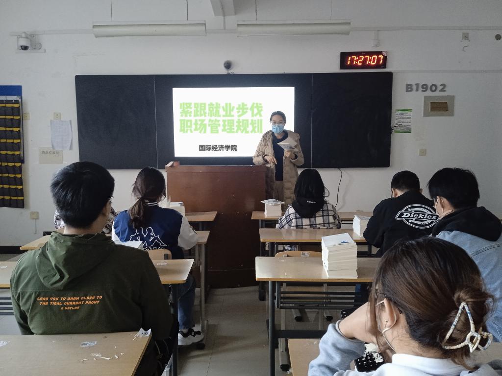 为了帮助2022届毕业生做好求职准备工作,促进毕业生高质量就业,2021年11月5日,国际经济学院辅导员李彤辉老师组织毕业生在2J418开展了主题为“紧跟就业步伐,职场管理规划”的班会。