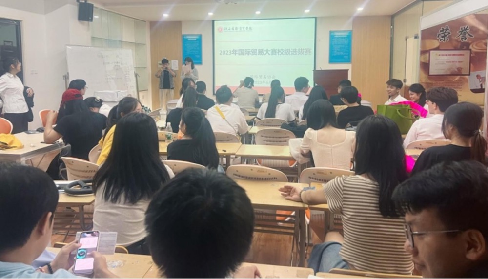 2023年6月29日星期四上午九点,由国际经济学院主办、国际贸易协会承办的以“展示团队风采 弘扬国际精神”为主题的2023年国际贸易大赛校级选拔赛在3J会展综合实训展厅成功举办。本次大赛由国际贸易协会社长赵俊梅主持,全体指导老师和参赛学生参与。