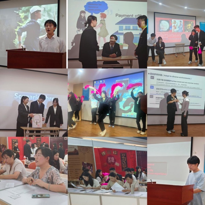 本次竞赛面向全校各学院各年级学生展开,经过多轮筛选后,共六支队伍参加了本次的校级总决赛,他们分别是“你是电你是光队”,“天天向上队”,“红高粱秧歌队”,“畅享队”等。竞赛通过参展策划书(中文)、展位海报设计与商品陈列、新产品发布会(英语)、商贸配对贸易谈判(英文)四个部分来考察各组。