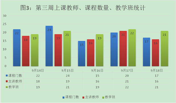 本周上课时间为5天。学院第三周计划开出课程98门次,实际开出98门次,课程开出率为100%。总体运行情况具体见表 1。