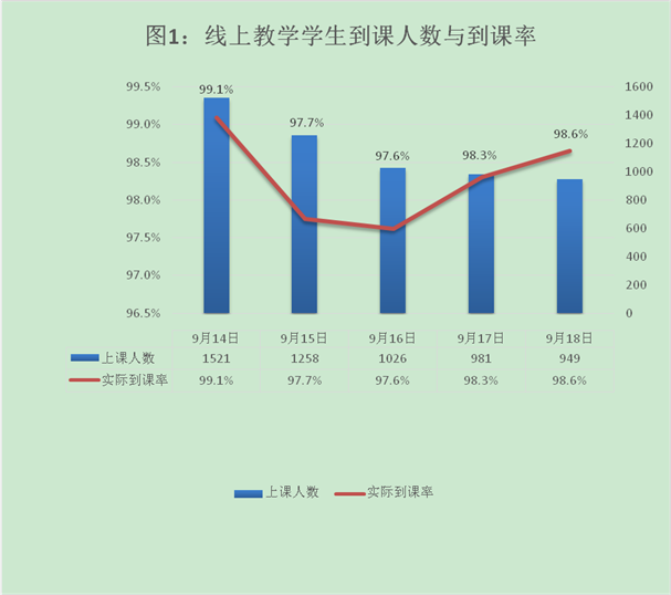 本周学生到课应到5833人次,实到5735人次,总体到课率98.3%,9月14日至9月11日学生实际到课情况见图1。