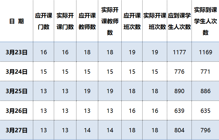 3月23日至3月27日,国际经济学院第五周计划开出课程70门次,实际开出70门次,课程开出率为100%。86个班次的教学任务全部顺利完成,完成率 100%。总体运行情况具体见表 1。