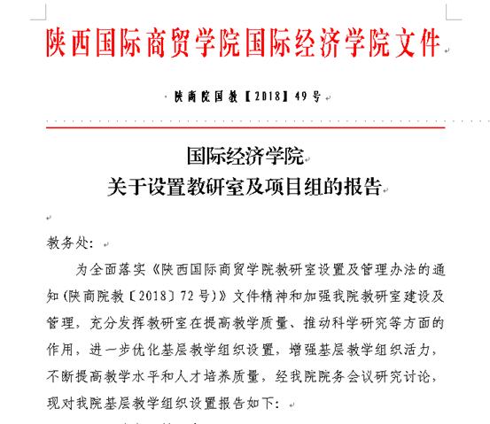 ——国际经济学院搭建“教研室+项目组”新型组织形式,提升组织活力。2018年9月,国际经济学院创新教研室组织结构形式,在专业划分教研室的基础上,通过统筹整合部分工作职责,设立“专项评估”、“课程改革”和“创新创业与产学研”三个项目组,选拔骨干教师担任项目组组长,充分发挥项目组在提高教学质量、推动科学研究等方面的作用,进一步优化基层教学组织设置,增强基层教学组织活力。