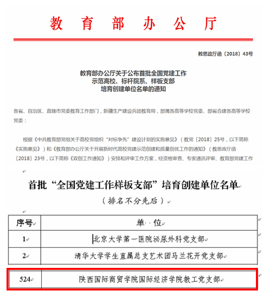 ——国际经济学院党总支荣获“陕西高等学校先进基层党组织”荣誉称号。2018年6月28日,中共陕西省委教育工作委员会下发《关于表彰全省高校先进基层党组织、优秀共产党员和优秀党务工作者的决定》(陕高教组〔2018〕54号)文件,国际经济学院党总支荣获“陕西高等学校先进基层党组织”;学院党总支副书记张孝峰、院长助理冯明分别被评为全省高校“优秀党务工作者”和“优秀共产党员”。