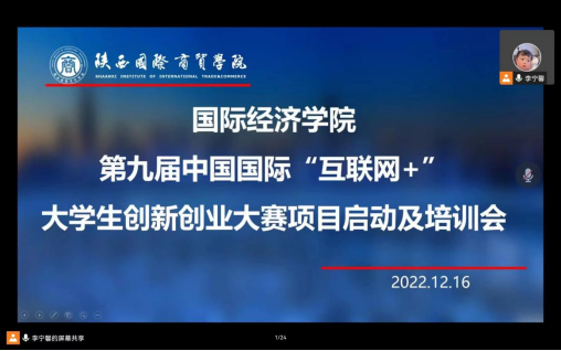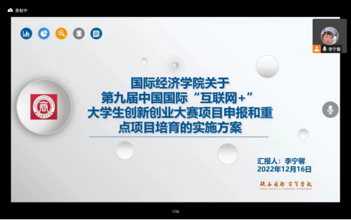 为更好地指导我院师生参加第九届中国“互联网+”大学生创新创业大赛,深入开展创新创业教育改革,强化创新创业实践,提高教师创新创业实践指导能力,培养学生创新创业思维及实践能力,国际经济学院于2022年12月16日下午在线上开展第九届中国国际“互联网+”创新创业大赛启动及培训会。此次会议由学院创新创业教研室主任李宁馨主持,学院党总支副书记荣超、副院长冯明、全体专职教师、辅导员老师及全体学生参加会议。