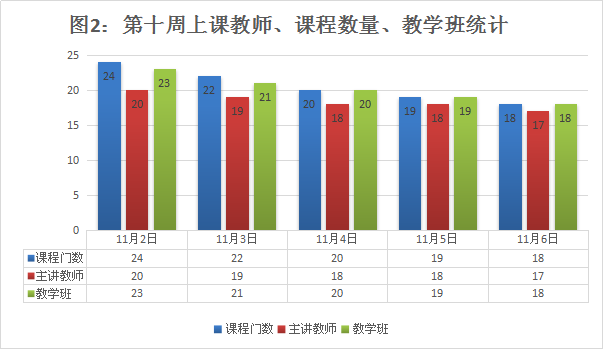 本周30名教师本周累计上课45门,累计上课319节次,总体运行情况见表2。