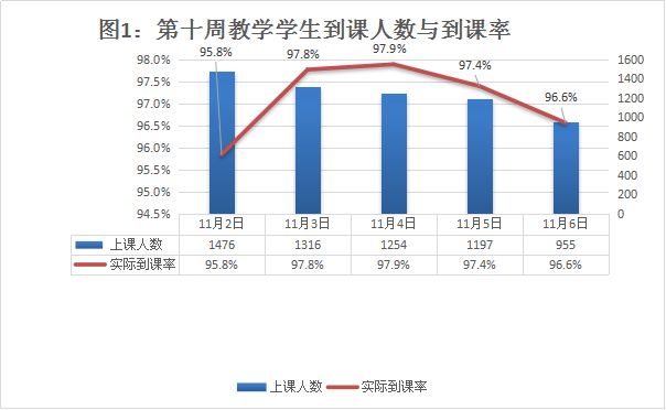 本周学生到课应到6385人次,实到6198次,总体到课率97.07%,11月2日至11月6日,学生实际到课情况见图1。