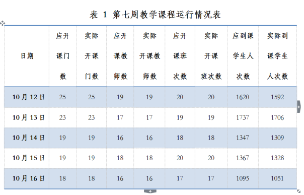 本周上课时间为5天。学院第七周计划开出课程104门次,实际开出104门次,课程开出率为100%。总体运行情况具体见表 1。
