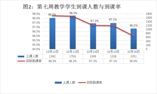 本周学生到课应到7166人次,实到6986次,总体到课率97.5%,10月12日至10月16学生实际到课情况见图1。