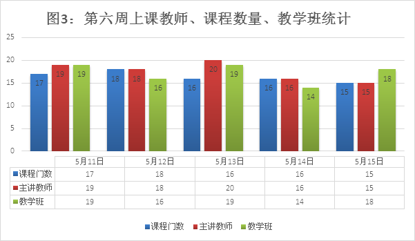 本周国际经济学院计划开设39门(公共课除外),实际开设39门,主讲教师26人,课程开出率100%。周一至周五具体开课门数、主讲教师和教学班详细信息见图2。本周教师使用的辅助平台有QQ群,微信群、钉钉直播、腾讯会议等,在线开课情况良好。