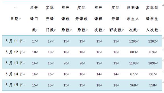 5月11—15日,国际经济学院第十二周计划开出课程82门次,实际开出82门次,课程开出率为100%。86个班次的教学任务全部顺利完成,完成率 100%。总体运行情况具体见表 1。