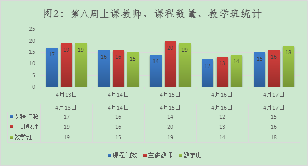 本周国际经济学院计划开设39门(公共课除外),实际开设39门,主讲教师26人,课程开出率100%。周一至周五具体开课门数、主讲教师和教学班详细信息见图2。本周教师使用的辅助平台有QQ群,微信群、对分易、腾讯会议等。