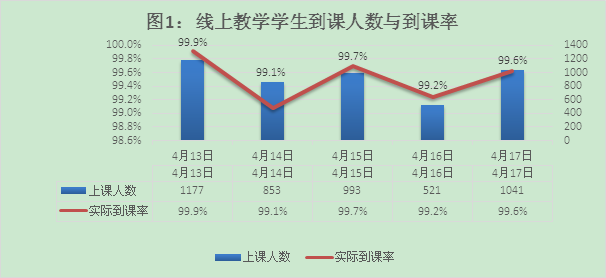 本周学生到课应到4605人次,实到4585,总体到课率99.57% ,周一至周五学生实际到课情况见图1。