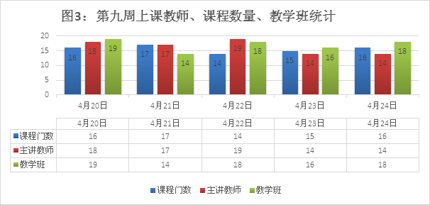 本周国际经济学院计划开设39门(公共课除外),实际开设39门,主讲教师26人,课程开出率100%。周一至周五具体开课门数、主讲教师和教学班详细信息见图2。本周教师使用的辅助平台有QQ群,微信群、对分易、腾讯会议等。