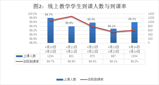 本周学生到课应到4694人次,实到4669,总体到课率99.47% ,周一至周五学生实际到课情况见图1。