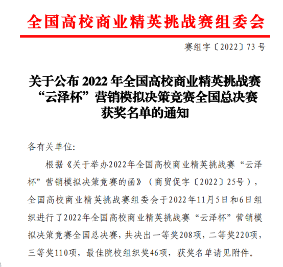 喜报 国际经济学院学生代表队在2022年全国高校商业精英挑战赛“云泽杯”营销模拟决策竞赛全国总决赛中再获佳绩