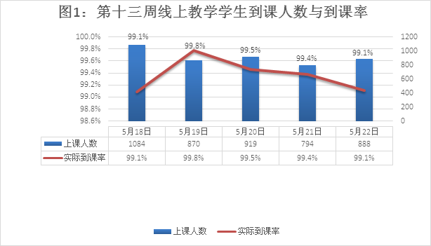 本周学生到课应到4584人次,实到4555,总体到课率99.37% ,学生实际到课情况见图1。