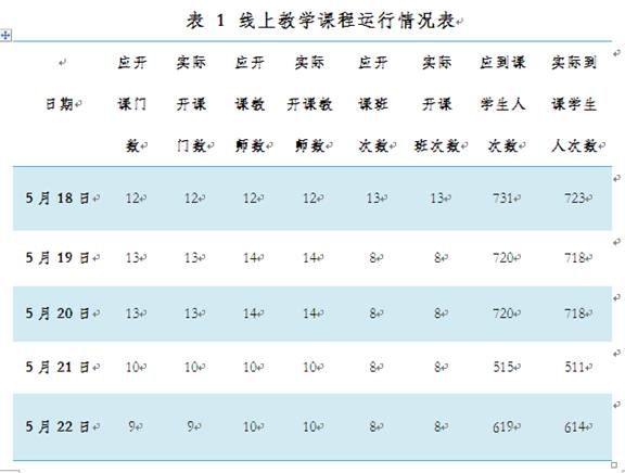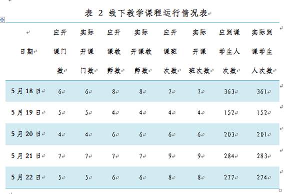 5月18—22日,国际经济学院第十三周线上计划开出课程57门次,线下计划开出课程27门次,总共开出84门次,课程开出率为100%。线上线下79个班次的教学任务全部顺利完成,完成率 100%。总体运行情况具体见表 1、表2。