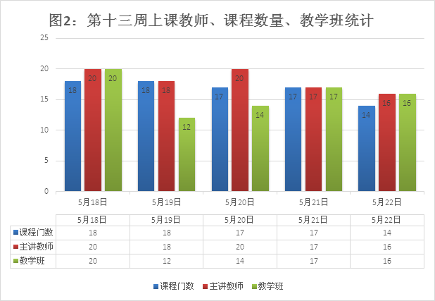 本周国际经济学院计划开设39门(公共课除外),实际开设39门,主讲教师26人,课程开出率100%。周一至周五具体开课门数、主讲教师和教学班详细信息见图2。本周教师使用的辅助平台有QQ群,微信群、钉钉直播、腾讯会议等,在线开课情况良好。