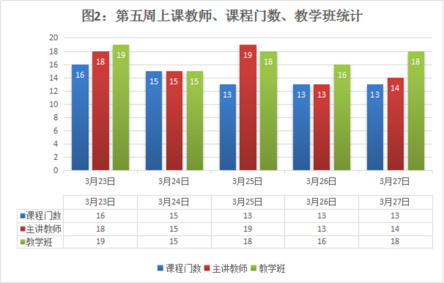 本周国际经济学院计划开设39门(公共课除外),实际开设39门,主讲教师26人,课程开出率100%。周一至周五具体开课门数、主讲教师和教学班详细信息见图2。本周教师使用的辅助平台有QQ群,微信群、对分易、腾讯会议等。