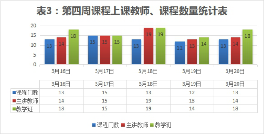 3 月 16 日至 3 月 20 日,国际经济学院第四周计划开出课程 66门次,实际开出 66 门次,课程开出率 100%。84个班次的教学任务全部顺利完成,完成率 100%。总体运行情况具体如表 1 所示。