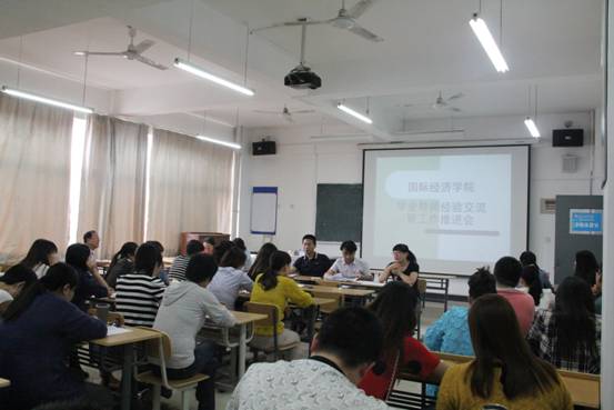 2015年9月18日下午,国际经济学院在2J334多媒体教室召开新学期学业导师经验交流暨工作推进会,学院全体学业导师及辅导员参加了会议,会议由党总支副书记张孝峰主持。
