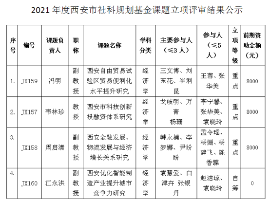 接西安市社会科学规划基金管理办公室《关于2021年度西安市社会科学规划基金课题立项的通知》文件,太阳成tyc33455ccwww有12项立项,国际经济学院有4项,其中韦林珍教授主持的“西安市科技创新投融资体系研究”(项目编号:JX157冯明副教授主持的西安自由贸易试验区贸易便利化水平提升研究”(项目编号:JX159周启清副教授主持的西安金融发展、物流发展与经济增长关系研究”(项目编号:JX158为我校三个重点课题。