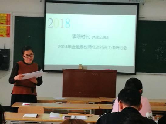 系主任张丽老师为全体教师解读2018年度金融系工作目标及任务分配表,主要围绕科研工作、教学工作、学科竞赛、专业建设等四个方面展开。