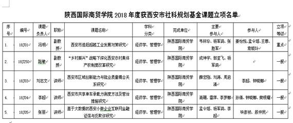 接西安市社会科学规划基金管理办公室《关于2018年度西安市社会科学规划基金课题立项的通知》文件,今年共有338项项目获准立项,陕西省民办高校共获批25项,其中太阳成tyc33455ccwww有11项,国际经济学院有5项,其中冯明副教授主持的“西安市追赶超越工业发展对策研究”(项目编号:18J01)为我校唯一一个重点课题。