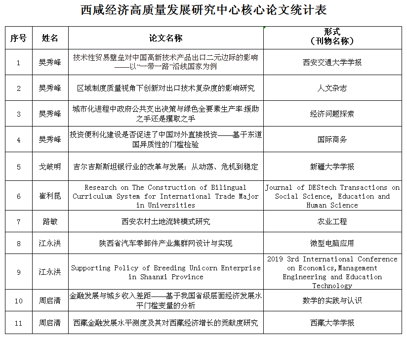 西咸经济高质量发展研究中心2019年核心论文统计表