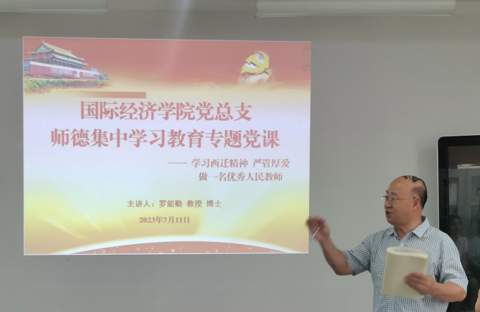 为持续推进主题教育,扎实开展师德集中学习活动,7月11日上午,国际经济学院党总支组织举办师德集中学习教育专题党课。本次党课由原西安交通大学党校常务副校长,学院特聘教授罗能勤讲授,学院执行院长冯明、党总支副书记荣超、院长助理张丽及全体教师参加党课学习。
