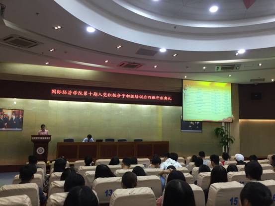 2018年9月16日晚19:00,国际经济学院党总支第十期入党积极分子初级班开班典礼在学术报告厅举行,学院党总支副书记张孝峰、学生第一党支部宣传委员常伟、第二党支部组织委员徐亚岚以及100余名入党积极分子参加了典礼,开班典礼由学生第一党支部书记荣超主持。