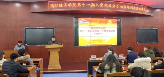 2018年12月17日晚19:00,国际经济学院党总支第十一期入党积极分子初级班开班典礼在经管实验中心举行,学院党总支副书记张孝峰,马克思主义学院马克思基本原理教研室主任张杰,学生第二党支部书记李彤辉,支部组织委员徐亚岚以及120余名入党积极分子参加了典礼,典礼由学生第一党支部书记荣超主持。