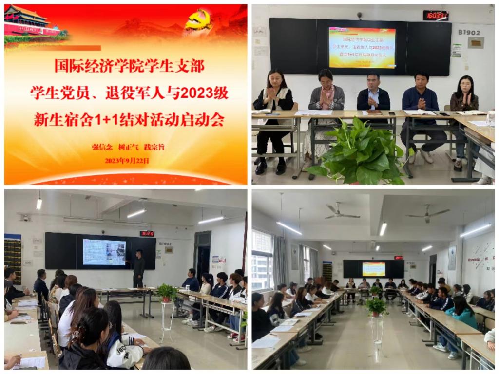 为深入贯彻落实习近平新时代中国特色社会主义思想,落实立德树人根本任务,有力推进党建进学生公寓工作有效开展,充分发挥学生公寓育人载体作用发挥,9月22日下午,国际经济学院学生党支部召开党员、退役复学军人与新生宿舍“1+1”结对共建活动启动会。学院党总支副书记荣超、学生第一、第二党支部书记徐亚岚、龚子腾、学管干事常伟、辅导员刘翔、学生党员、退役复学军人以及2023级新生宿舍长参加会议,会议由徐亚岚主持。