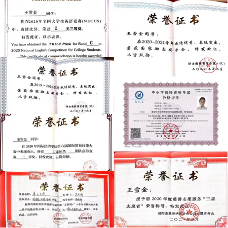 我在2022年5月拿到教师资格证,2020-2021学年荣获国家励志奖学金,2021年3月荣获大学生创新创业大赛二等奖,2021年2021年3月荣获三星志愿者称号,2020年11月荣获全国大学生英语竞赛三等奖,2020年荣获国际贸易大赛二等奖。2019-2020年荣获国家励志奖学金。