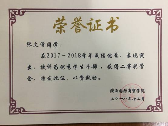 ——2017—2018学年“优秀学生干部二等奖学金”获得者 我院国际经济与贸易专业B1601班 张文倩