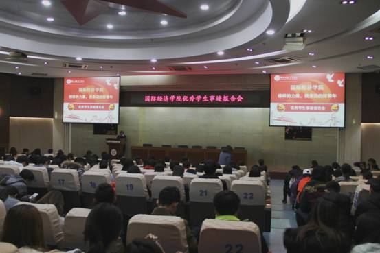 根据学生工作处有关安排,为进一步加强学风建设,充分发挥先进典型的示范和引领作用,集中展示我院大学生积极健康向上的精神风貌,引导广大同学向先进典型学习,坚定理想信念,明确发展方向。12月21日晚19:00,学院在学术报告厅举行“榜样的力量•我身边的好青年”优秀学生事迹报告会。国际经济学院党总支副书记张孝峰、院长助理冯明、各系系主任及全体辅导员和400余名学生代表参加了报告会。报告会由学工办主任荣超主持。